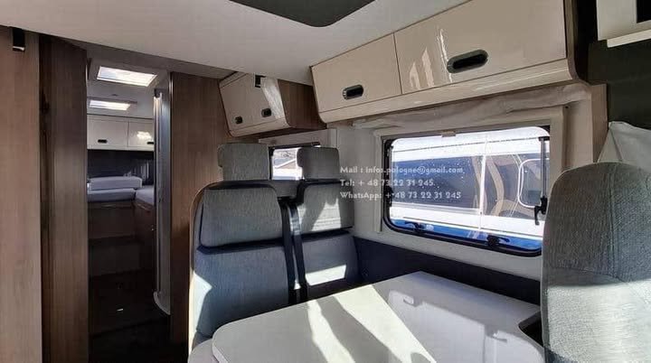 Ce Sun Living S75 SL, de la gamme du groupe Adria, combine espace, confort et praticité. Avec son lit pavillon électrique et ses lits jumeaux arrière, il offre un agencement idéal pour la famille ou les voyages à deux avec confort.